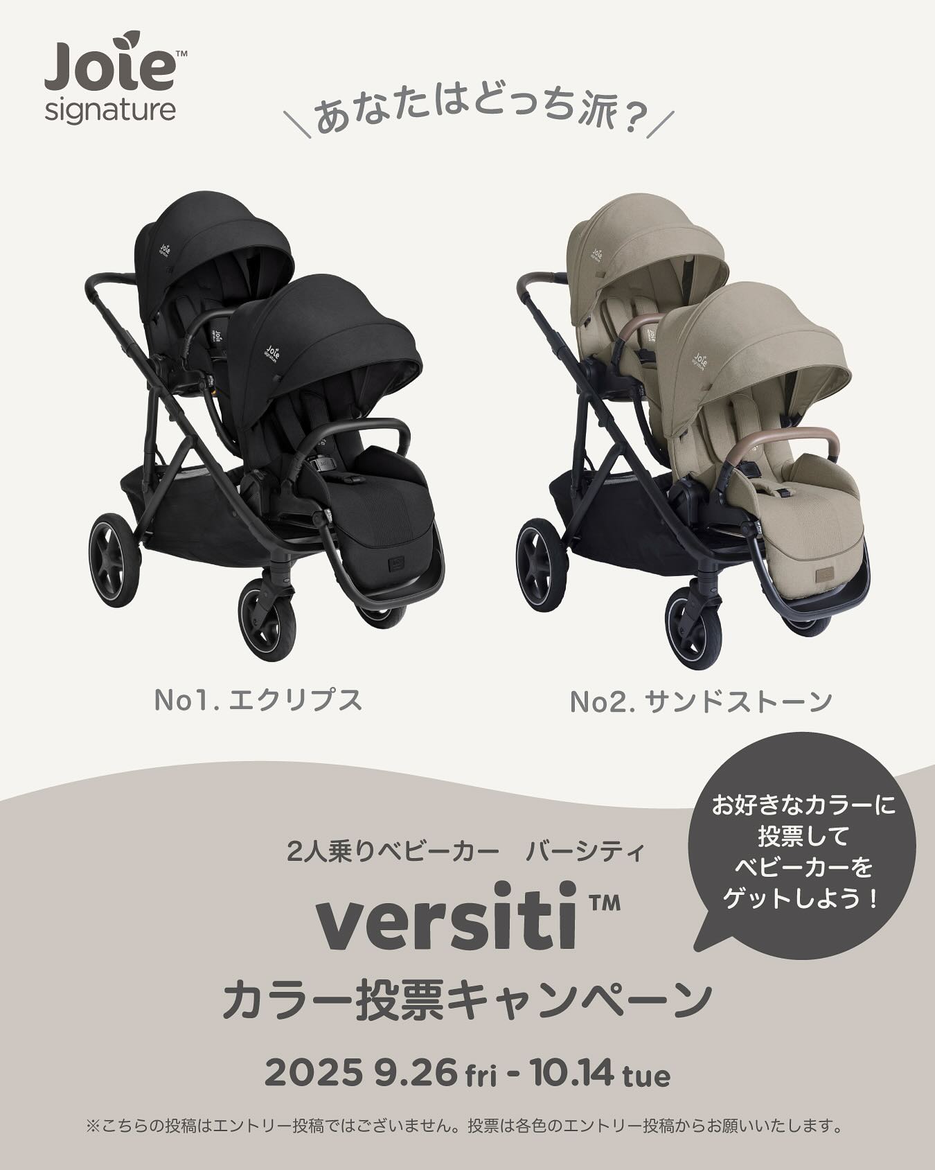 【Instagram懸賞】2人乗りベビーカー Versitiを1名様にプレゼント 2025.10.12Joie‐Versiti カラー投票キャンペーン 賞品:2人乗りベビーカー Versiti(1名様) 締切:2025年10月14日(火)お好きなカラーに投票して2人乗りベビーカーをゲットしよう!※詳細はキャンペーンページにてご確認ください。応募はこちらから
