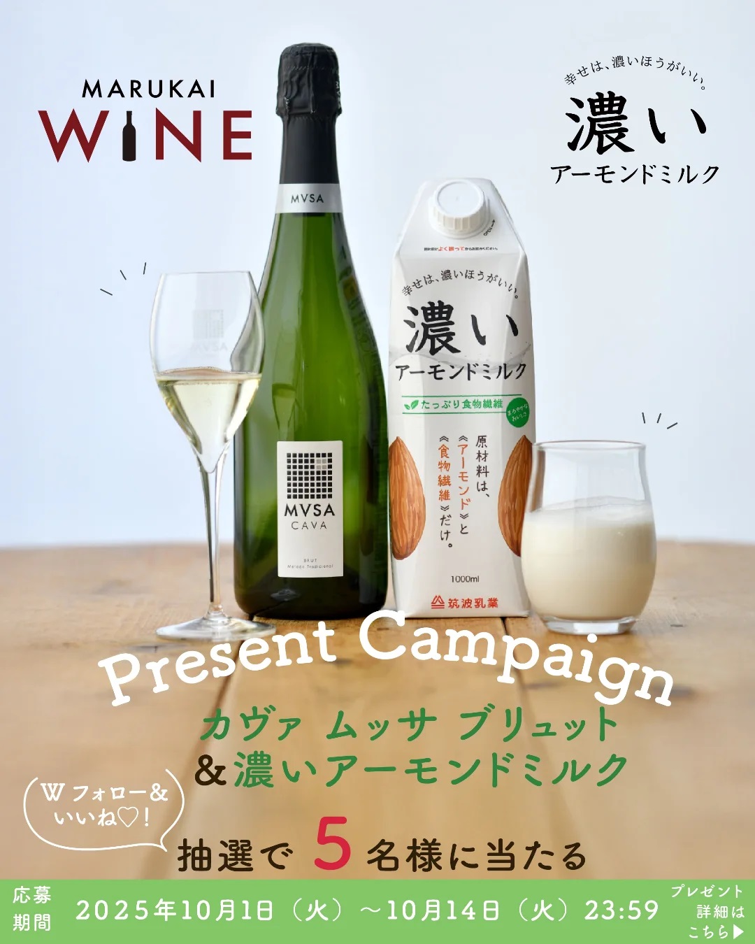 賞品:カヴァ ムッサ ブリュット 750ml&濃いアーモンドミルク たっぷり食物繊維 1000ml(5名様)