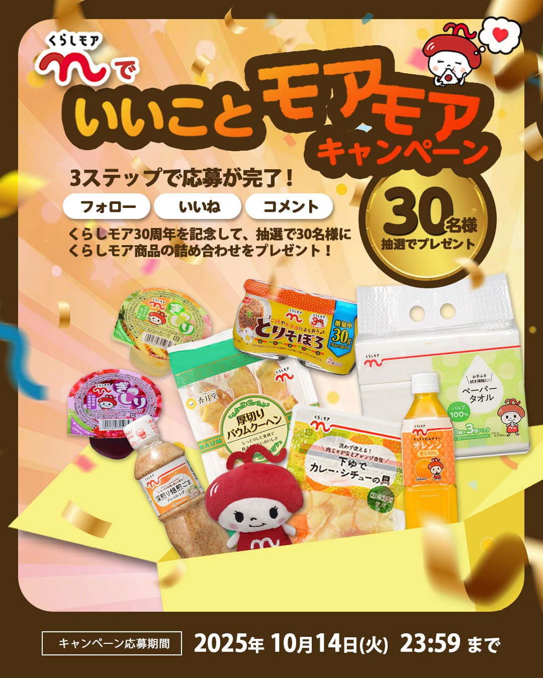 賞品:くらしのモアちゃんぬいぐるみ&くらしモア商品詰め合わせ(30名様)