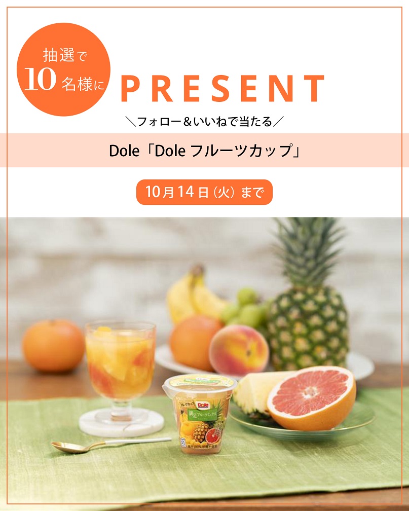 賞品:「Doleフルーツカップ」贅沢ピーチ・満足フルーツミックス・至福のマンゴーの3種類を2個ずつ、計6個セット(10名様)