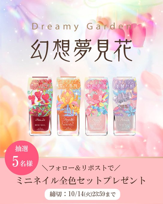 【X懸賞】パラドゥ ミニネイル全色セットを5名様にプレゼント 2025.10.12パラドゥ‐フォロー&リポストキャンペーン 賞品:ミニネイル全色セット(5名様) 締切:2025年10月14日(火)公式X(Twitter)アカウントをフォロー&キャンペーン対象ポストをリポストしてご応募ください。※詳細はキャンペーンページにてご確認ください。応募はこちらから