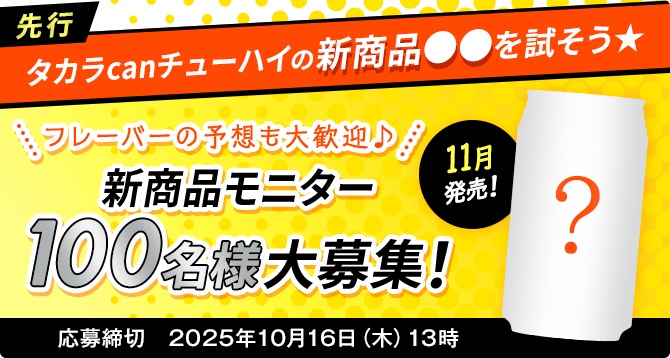 タカラ can チューハイ 3本を100名様にプレゼント 2025.10.12タカラcanチューハイの間‐新商品モニター100名大募集 賞品:タカラ can チューハイ 3本(100名様) 締切:2025年10月16日(木)13時まで新商品をお試しいただく、モニター100名様を大募集※詳細はキャンペーンページにてご確認ください。応募はこちらから