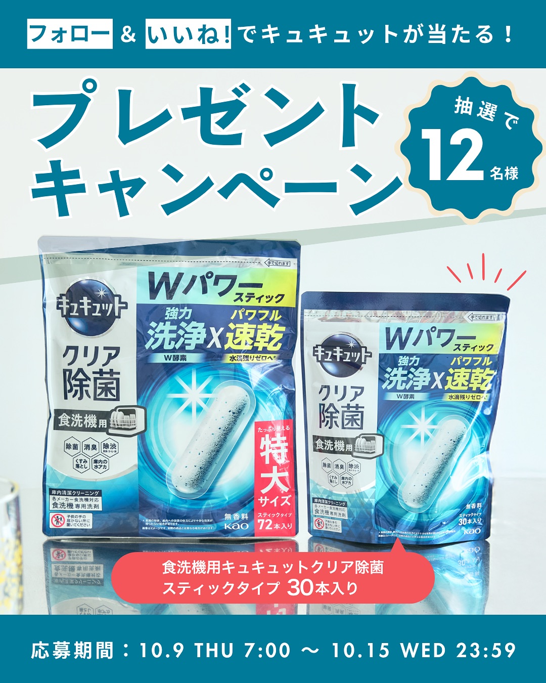 【Instagram懸賞】食洗機用キュキュットクリア除菌 スティックタイプ30本入りを12名様にプレゼント