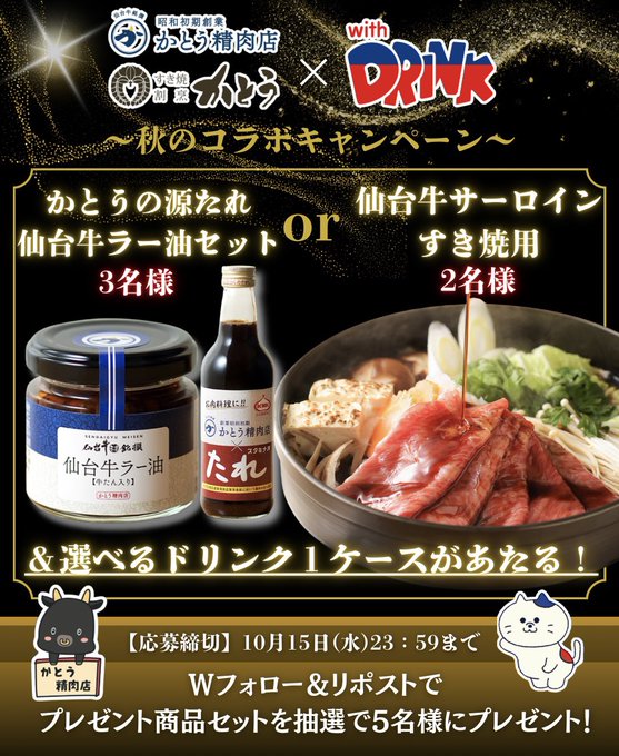 賞品:かとうの源たれ、仙台牛ラー油、仙台牛サーロインすき焼用、ドリンク1箱(合計5名様)