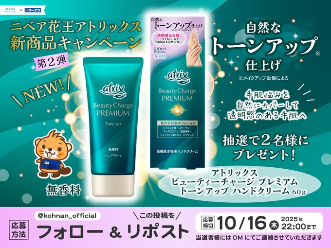 賞品:ニベア花王 アトリックス ビューティーチャージプレミアム トーンアップ ハンドクリーム(2名様)