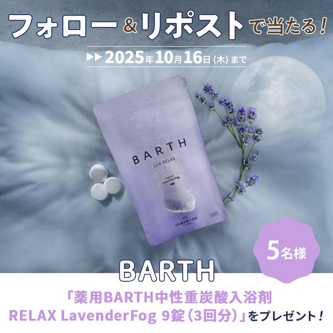 【X懸賞】薬用BARTH中性重炭酸入浴剤RELAX LavenderFog 9錠を5名様にプレゼント
