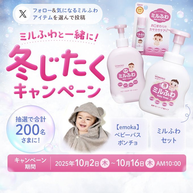 賞品:emoka ベビーバスポンチョ、ミルふわセット(200名様)