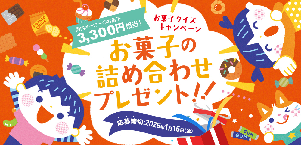 お菓子の詰め合わせ3,300円相当を3,300名様にプレゼント 2025.10.14お菓子ナビ.com‐お菓子クイズキャンペーン 賞品:お菓子の詰め合わせ 3,300円相当(3,300名様) 締切:2026年1月16日(金)クイズに答えてご応募ください。※詳細はキャンペーンページにてご確認ください。応募はこちらから