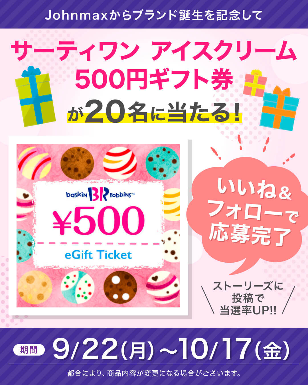 賞品:サーティワン アイスクリーム 500円ギフト券(20名様)