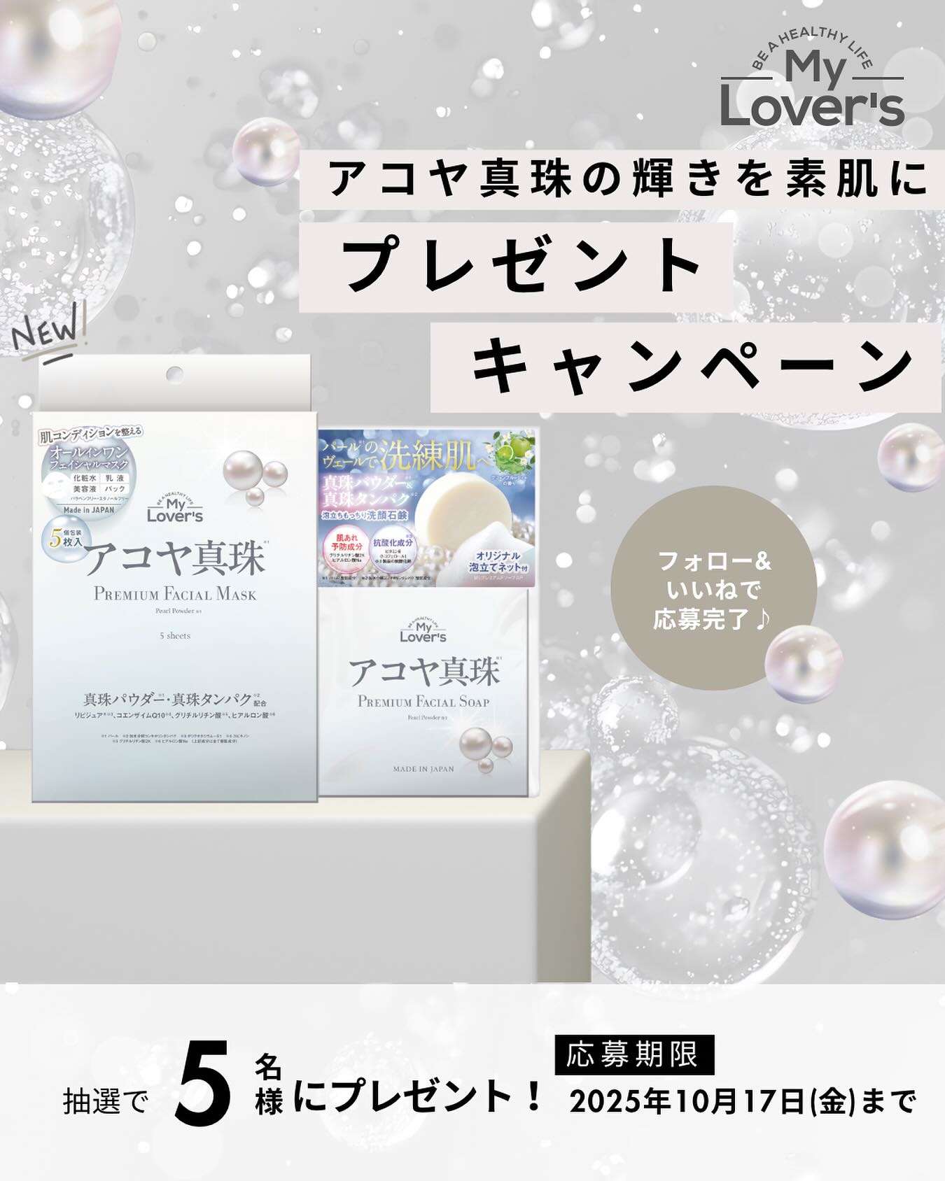 賞品:アコヤ真珠Premium Facial Mask 5枚入り&アコヤ真珠Premium Facial Soap(5名様)