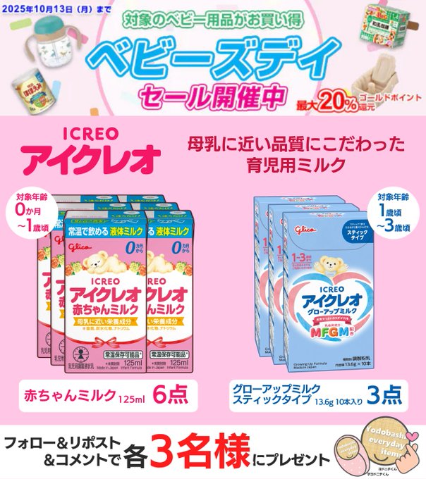 【X懸賞】アイクレオ「赤ちゃんミルク」「グローアップミルク」を合計6名様にプレゼント