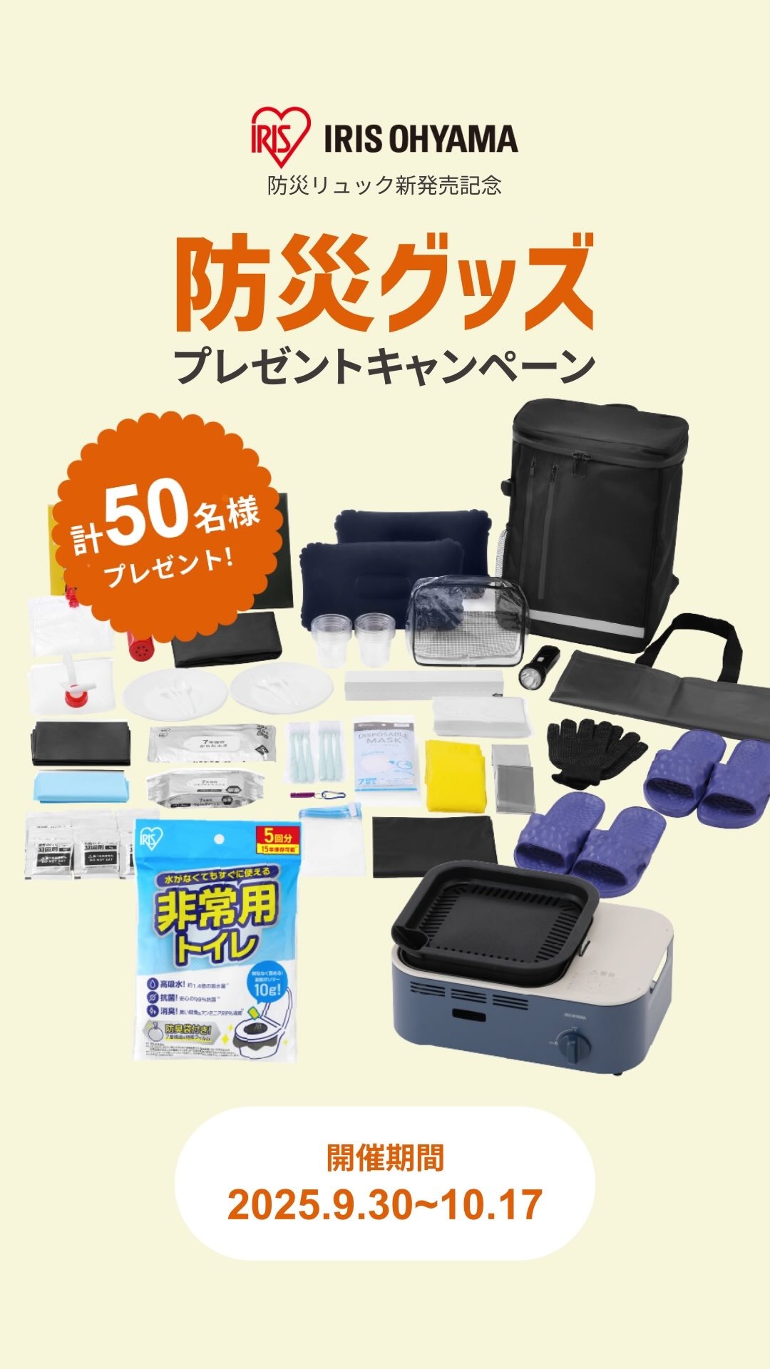 【X・Instagram懸賞】3日間分の緊急防災セット、カセットコンロ減煙設計 アッシュネイビー、非常用トイレセットを合計50名様にプレゼント 2025.10.15アイリスオーヤマ株式会社‐防災グッズプレゼントキャンペーン 賞品: ①3日間分の緊急防災セット2人用…10名様 ②カセットコンロ減煙設計 アッシュネイビー…20名様 ③非常用トイレセット 5回分…20名様 締切:2025年10月17日(金)【応募方法】 ①@irisohyama_info をフォロー ②投稿を10/17(金)までにRP🔃 ③欲しい商品をリプライで教えて💬Instagramでも同時開催中🎉※詳細はキャンペーンページにてご確認ください。応募はこちらから