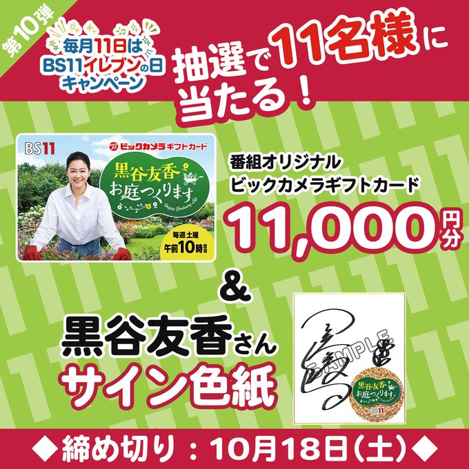 賞品:番組オリジナルのビックカメラギフトカード11,000円分&黒谷友香さん直筆サイン色紙(11名様)