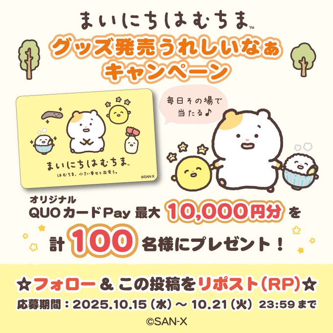 賞品:まいにちはむちまのオリジナルQUOカードPay最大10000円分(100名様)