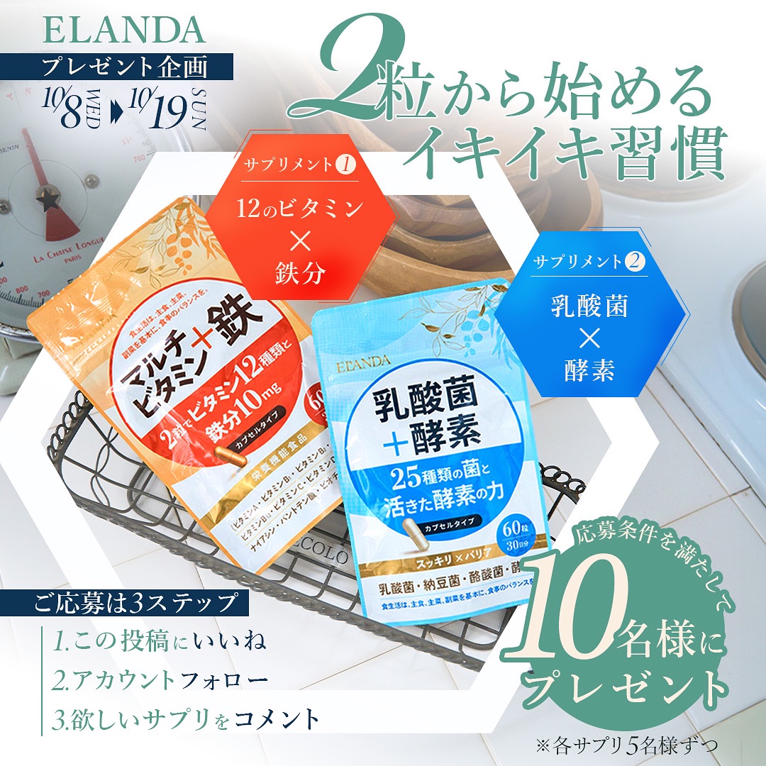 【Instagram懸賞】エランダ サプリメントシリーズ 乳酸菌+酵素、マルチビタミン+鉄を10名様にプレゼント