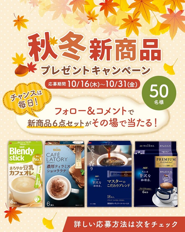 【毎日・Instagram懸賞】AGF®秋冬新商品セットが50名様にその場で当たる! 2025.10.16味の素AGF‐秋冬新商品発売記念 賞品:AGF®秋冬新商品セット(50名様) 締切:2025年10月31日(金)応募方法 ①アカウントをフォロー ②投稿に飲みたい商品をコメント※詳細はキャンペーンページにてご確認ください。応募はこちらから