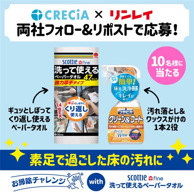 賞品:スコッティ ファイン 洗って使えるペーパータオル 強力厚手 47カット 1ロール、リンレイ つやピカワックス&コート スプレー 1本(10名様)