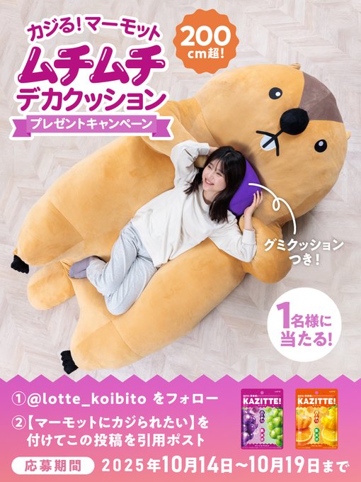 【X懸賞】デカクッションを1名様にプレゼント 2025.10.16お口の恋人 ロッテ/LOTTE‐プレゼントキャンペーン 賞品:デカクッション(1名様) 締切:2025年10月19日(日)①@lotte_koibito をフォロー ②【マーモットにカジられたい】を付けて投稿を引用ポスト※詳細はキャンペーンページにてご確認ください。応募はこちらから
