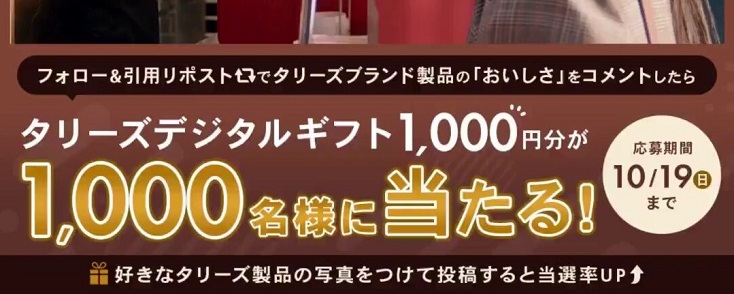 タリーズ製品の写真付きで投稿すると当選率UP!