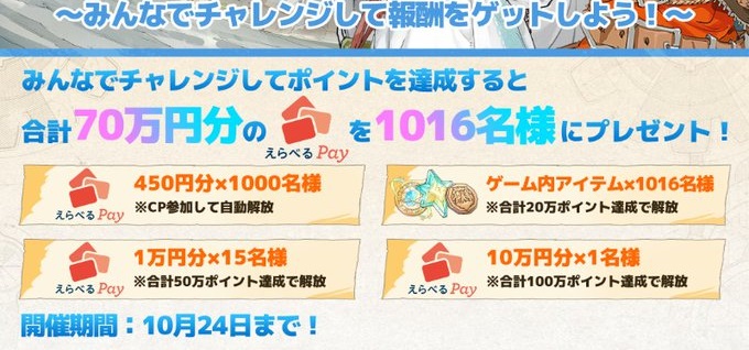 賞品:えらべるPay最大10万円分(最大1,016名様)