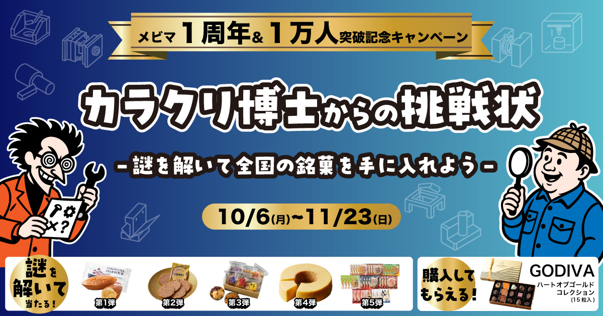 全国の銘菓を合計150名様にプレゼント 2025.10.17メビーマーケットプレイス 謎解きキャンペーン 賞品:全国の銘菓(合計150名様) 締切:2025年11月23日(日)謎を解いて全国の銘菓をゲットしよう! 最大150名様に、抽選で全国の銘菓をプレゼント!※詳細はキャンペーンページにてご確認ください。応募はこちらから
