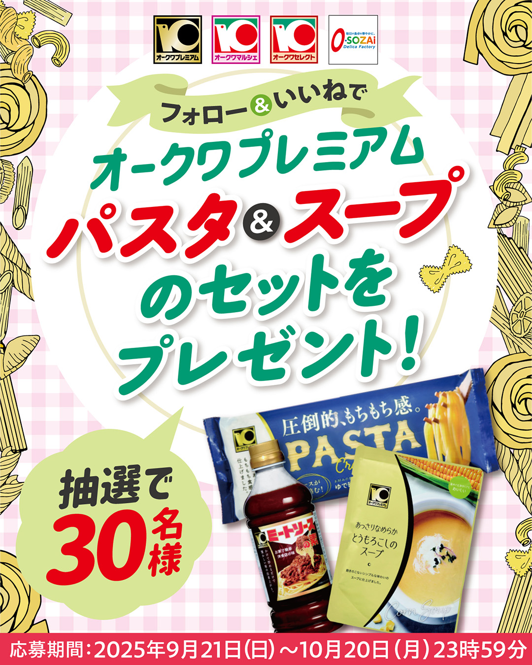 賞品:オークワプレミアムパスタ&スープ(30名様)
