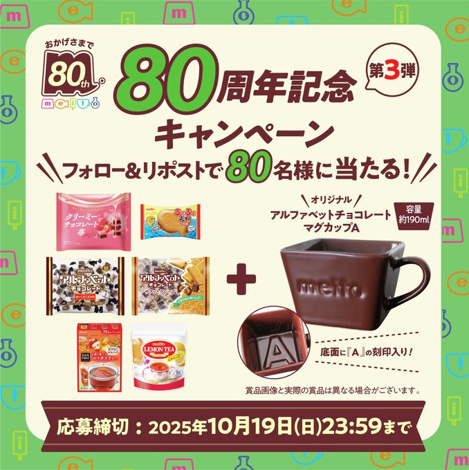 賞品:meito商品詰め合わせ&アルファベットチョコレート型のマグカップ(80名様)