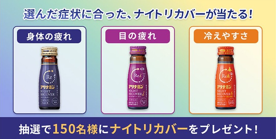 【X懸賞】ナイトリカバーを150名様にプレゼント 2025.10.17アリナミン‐プレゼントキャンペーン 賞品:ナイトリカバー(150名様) 締切:2025年10月19日(日)選んだ症状に合ったナイトリカバーが当たる!※詳細はキャンペーンページにてご確認ください。応募はこちらから