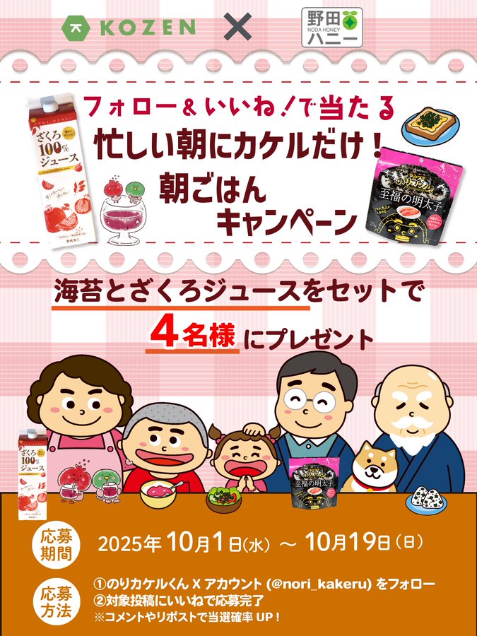 【X懸賞】カケルくんとざくろジュースを4名様にプレゼント 2025.10.17小善本店‐忙しい朝にカケルだけ!朝ごはんキャンペーン 賞品:カケルくんとざくろジュース(4名様) 締切:2025年10月19日(日)① @nori_kakeru をフォロー ② 投稿にいいね※詳細はキャンペーンページにてご確認ください。応募はこちらから