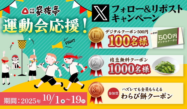 家族亭公式X(Twitter)アカウントをフォロー&キャンペーン対象ポストをリポストして、記載されているURLから応募ください。