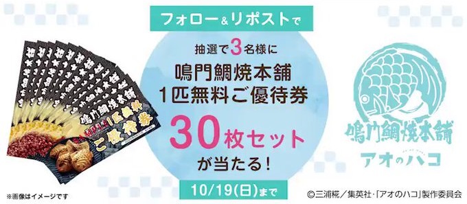 賞品:鳴門鯛焼本舗 1匹無料ご優待券30枚セット(3名様)