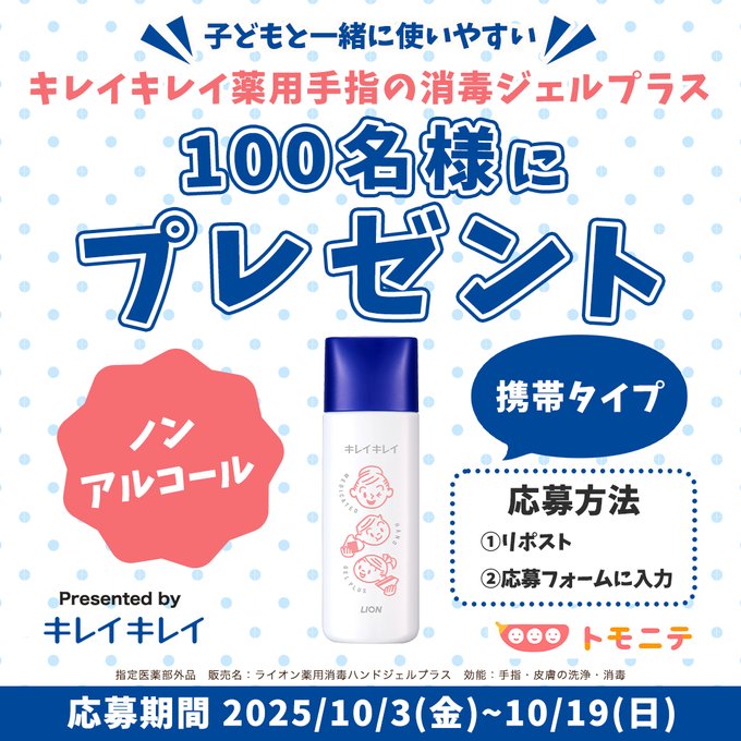 賞品:キレイキレイ 薬用手指の消毒ジェルプラス 携帯タイプ(100名様)
