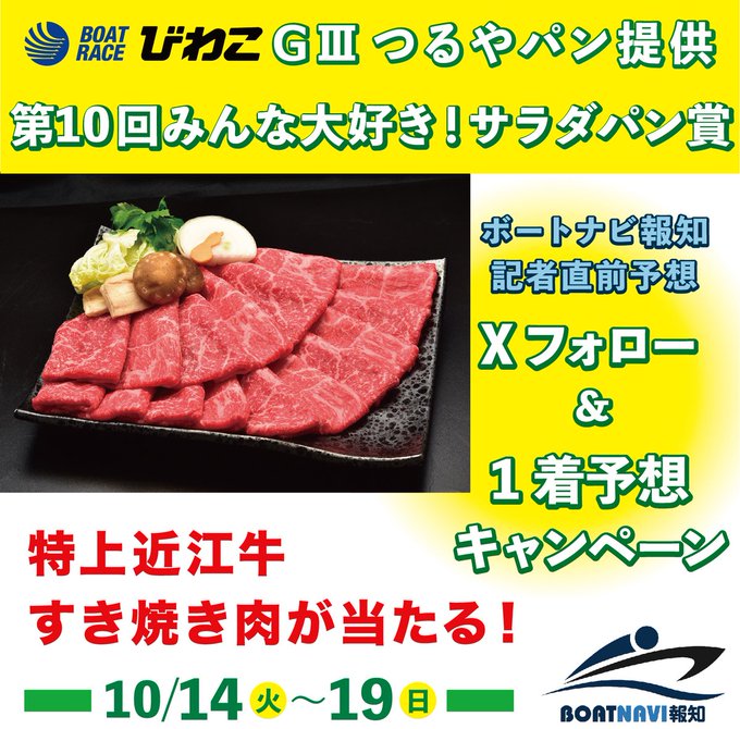 ②10月14日~19日に毎日、毎レースで投稿される、#直前予想 #サラダパン賞 #ボートレースびわこ の付いた直前予想ポストを「投稿レースの1着を予想」して引用ポスト(1回以上)