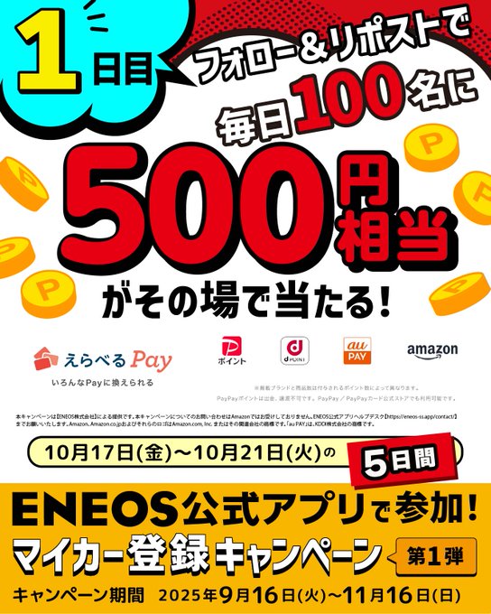 ENEOS公式アプリ アカウントをフォロー&キャンペーン対象ポストをリポストして、記載されているURLからご応募ください。