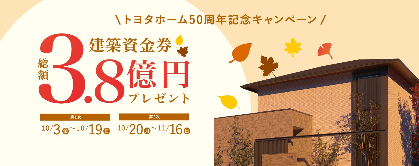 トヨタホーム建築または購入資金券 最大1,000万円分を合計196名様にプレゼント 2025.10.18トヨタホーム‐建築資金券1,000万円プレゼントキャンペーン 賞品:トヨタホーム建築または購入資金券 最大1,000万円分(合計196名様) 締切:2025年11月16日(日)アンケートに答えてご応募ください。※詳細はキャンペーンページにてご確認ください。応募はこちらから