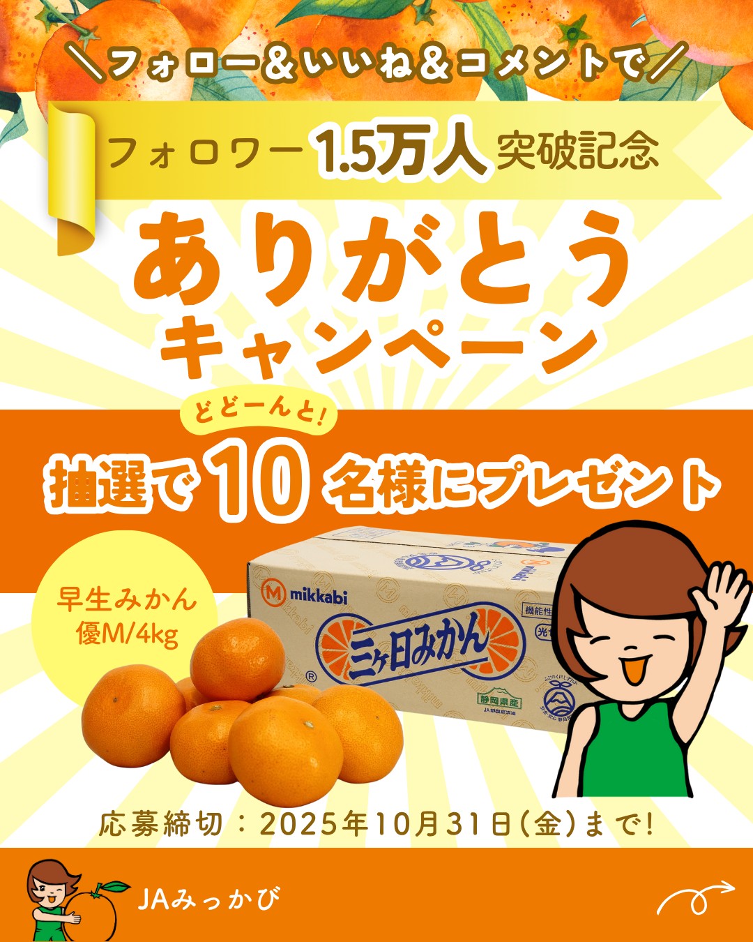 JAみっかび「三ヶ日みかん」‐フォロワー1.5万人突破 ありがとうキャンペーン