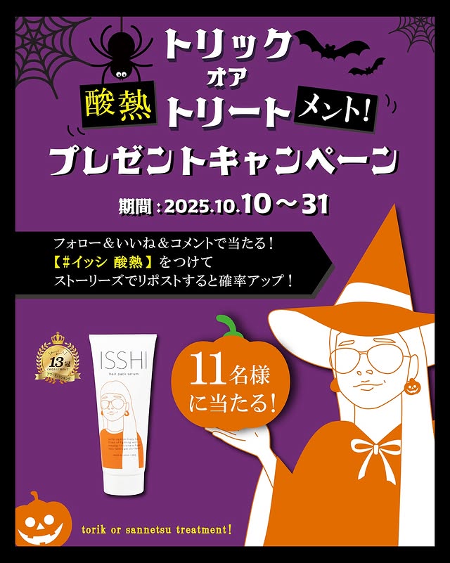 【Instagram懸賞】イッシ ヘアパックセラムを11名様にプレゼント 2025.10.18ISSHI‐トリックオア酸熱トリートメント 賞品:イッシ ヘアパックセラム(11名様) 締切:2025年10月31日(金)①イッシ公式インスタグラムをフォロー ②投稿にいいね&コメント※詳細はキャンペーンページにてご確認ください。応募はこちらから