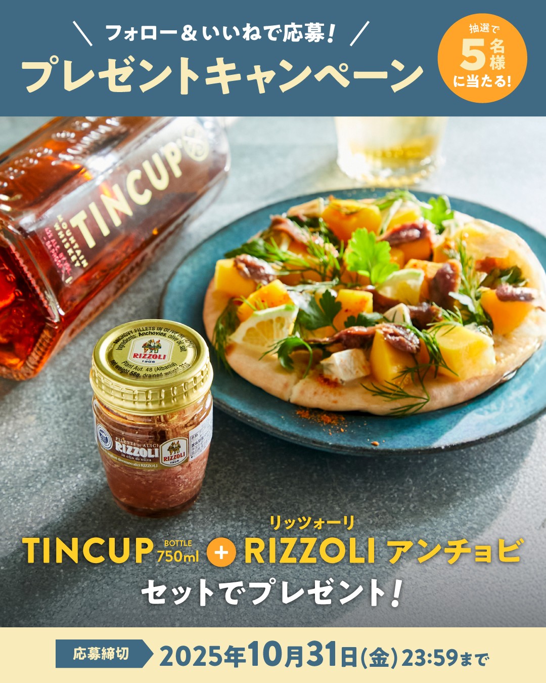 賞品:RIZZOLI アンチョビフィレ&アメリカンウイスキーTINCUP 750ml(5名様)