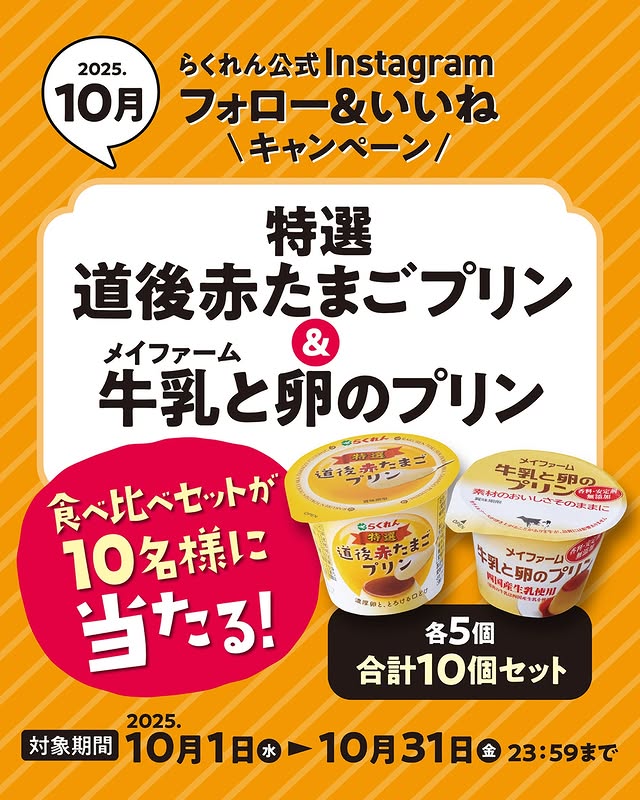 賞品:特選道後赤たまごプリン&メイファーム牛乳と卵のプリン(10名様)