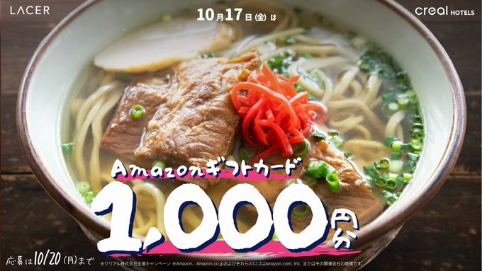 【X懸賞】Amazonギフトカード1,000円分を30名様にプレゼント 2025.10.18レイサー沖縄那覇‐フォロー&リポストキャンペーン 賞品:Amazonギフトカード1,000円分(30名様) 締切:2025年10月20日(月)応募方法▶@LACER_okinawaをフォロー▶選択肢から選んで投稿※詳細はキャンペーンページにてご確認ください。応募はこちらから