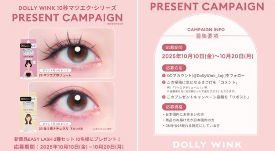 【X懸賞】EASY LASH 2種セットを10名様にプレゼント 2025.10.18DOLLY WINK‐プレゼントキャンペーン 賞品:EASY LASH 2種セット(10名様) 締切:2025年10月20日(月)① @DollyWink_koji をフォロー ② 投稿コメント&リポスト※詳細はキャンペーンページにてご確認ください。応募はこちらから