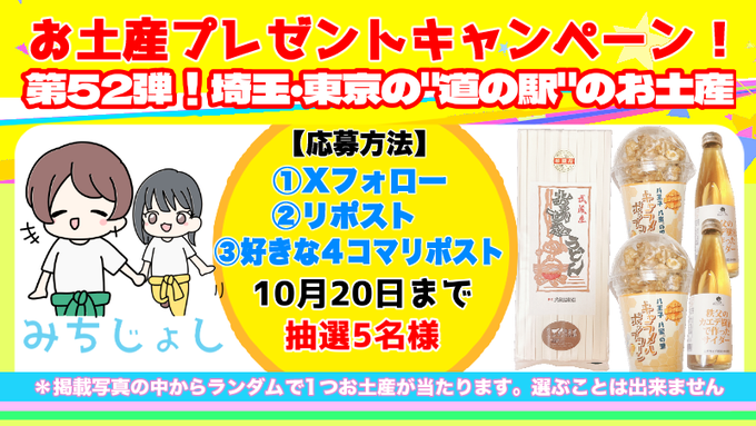 【X懸賞】埼玉・東京の道の駅のお土産を5名様にプレゼント 2025.10.18みちじょし お土産プレゼントキャンペーン 賞品:埼玉・東京の道の駅のお土産(5名様) 締切:2025年10月20日(月)応募方法 ①Xをフォロー ②投稿をリポスト ③好きな4コマをリポスト※詳細はキャンペーンページにてご確認ください。応募はこちらから