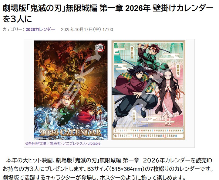 劇場版「鬼滅の刃」無限城編 第一章 2026年 壁掛けカレンダーを3名様にプレゼント 2025.10.18よみぽランド‐プレゼントキャンペーン 賞品:劇場版「鬼滅の刃」無限城編 第一章 2026年 壁掛けカレンダー(3名様) 締切:2025年11月5日(水)ご応募には会員登録/ログインが必要です。※詳細はキャンペーンページにてご確認ください。応募はこちらから