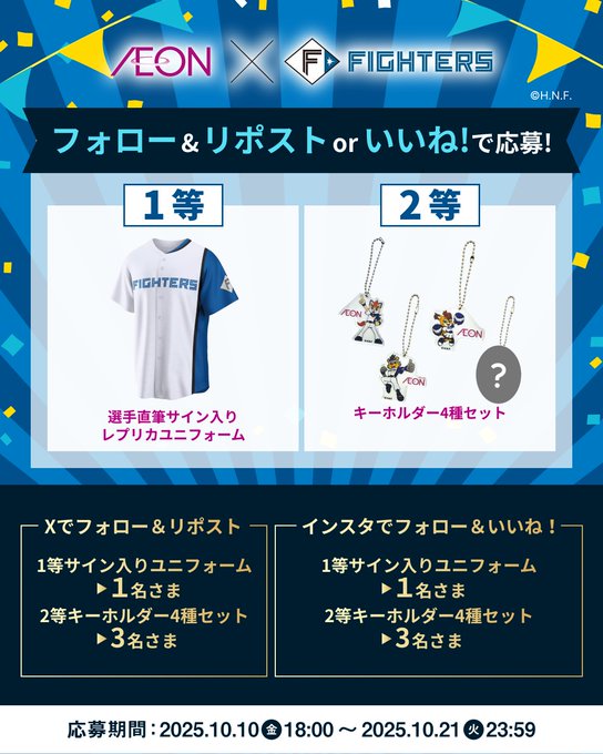 【X・Instagram懸賞】選手直筆サイン入りレプリカユニフォーム、ファイターズキーホルダー4種セットを8名様にプレゼント 2025.10.19イオン北海道‐フォロー&リポストキャンペーン 賞品:選手直筆サイン入りレプリカユニフォーム、ファイターズキーホルダー4種セット(8名様) 締切:2025年10月21日(火)公式X(Twitter)アカウントをフォロー&キャンペーン対象ポストをリポストしてご応募ください。InstagramInstagramからも応募できます。※詳細はキャンペーンページにてご確認ください。応募はこちらから