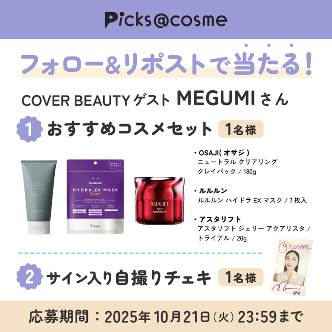 【X懸賞】MEGUMIさんおすすめコスメセット、サイン入り自撮りチェキを2名様にプレゼント