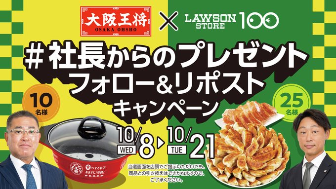 @osakaohsho_infoと@lawsonstore_100をフォロー&キャンペーン対象ポストをリポストしてご応募ください。