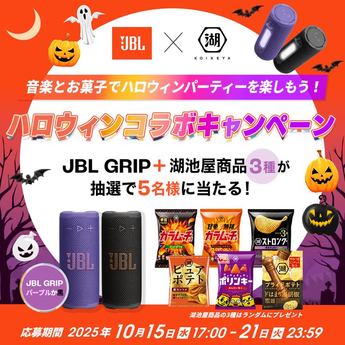 @JBL_JAPANと@koikeya_cpをフォロー&キャンペーン対象ポストをリポストしてご応募ください。