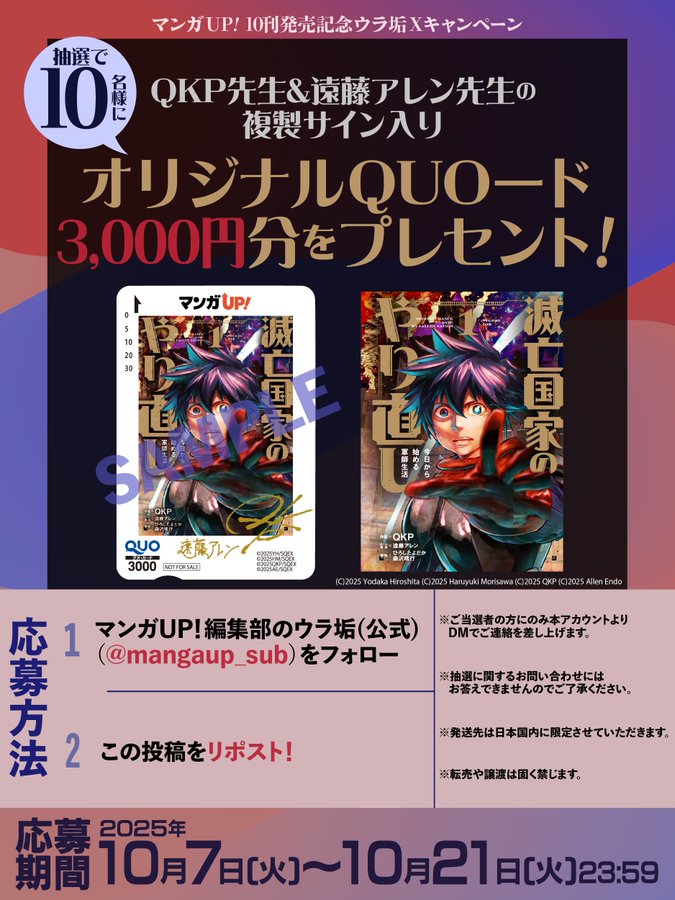 賞品:QKP先生&遠藤アレン先生の複製サイン入り3,000円分オリジナルQUOカード(10名様)