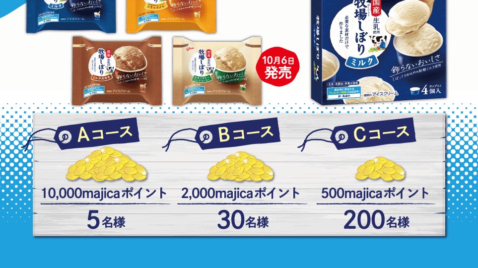 電子マネー majica‐牧場しぼりってしぼって3日以内の国産新鮮「生ミルク」を使ったなめらかアイスってマジかキャンペーン