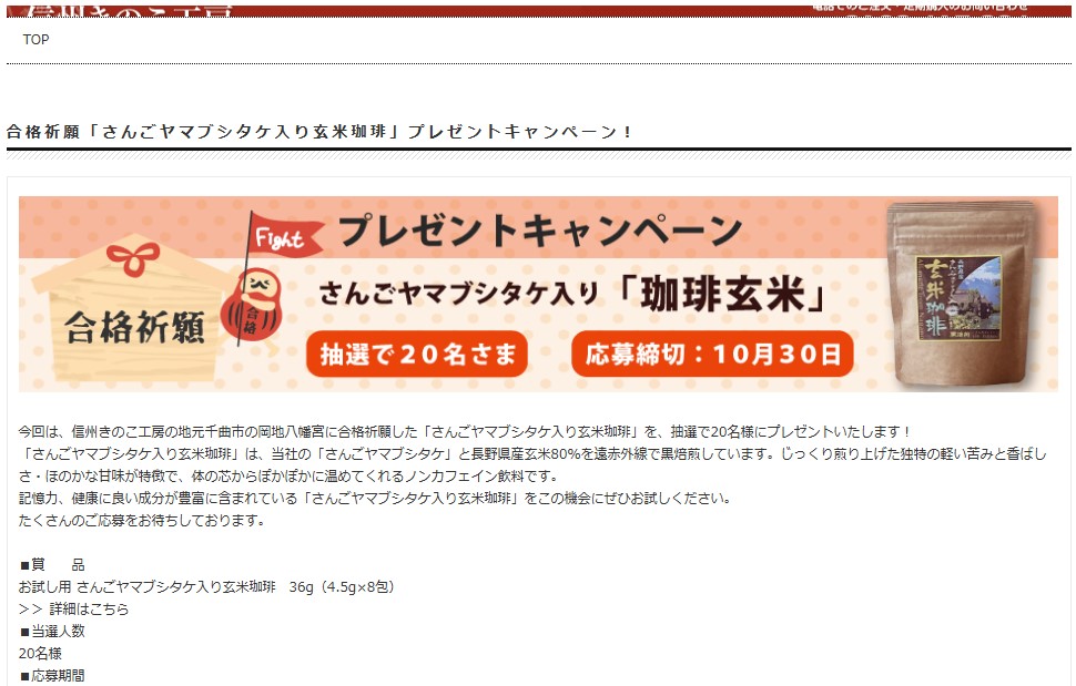 お試し用 さんごヤマブシタケ入り玄米珈琲 36gを20名様にプレゼント 2025.10.20 2025.10.19信州きのこ工房‐合格祈願「さんごヤマブシタケ入り玄米珈琲」プレゼントキャンペーン 賞品:お試し用 さんごヤマブシタケ入り玄米珈琲 36g(20名様) 締切:2025年10月30日(火)応募フォームより必要事項を入力してご応募ください。※詳細はキャンペーンページにてご確認ください。応募はこちらから